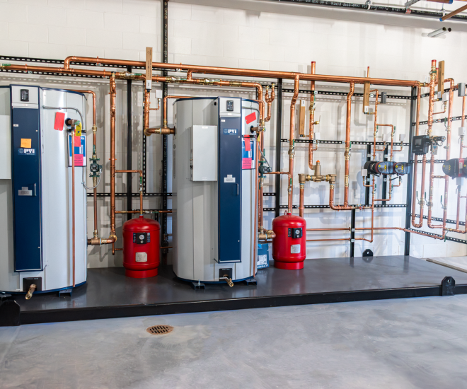 We manufacture modular mechanical penthouses that house chilled water systems, heating water equipment, and HVAC controls in prefabricated rooftop enclosures. Our penthouses integrate chillers, boilers, pumps, water heaters, mixing valves, VFDs, and complete electrical and controls scope into factory-tested assemblies. We work with architects and engineers to design layouts that free up interior space and streamline system tie-ins. The result is a fully prefabricated penthouse that drops in place that can accelerate the overall build.